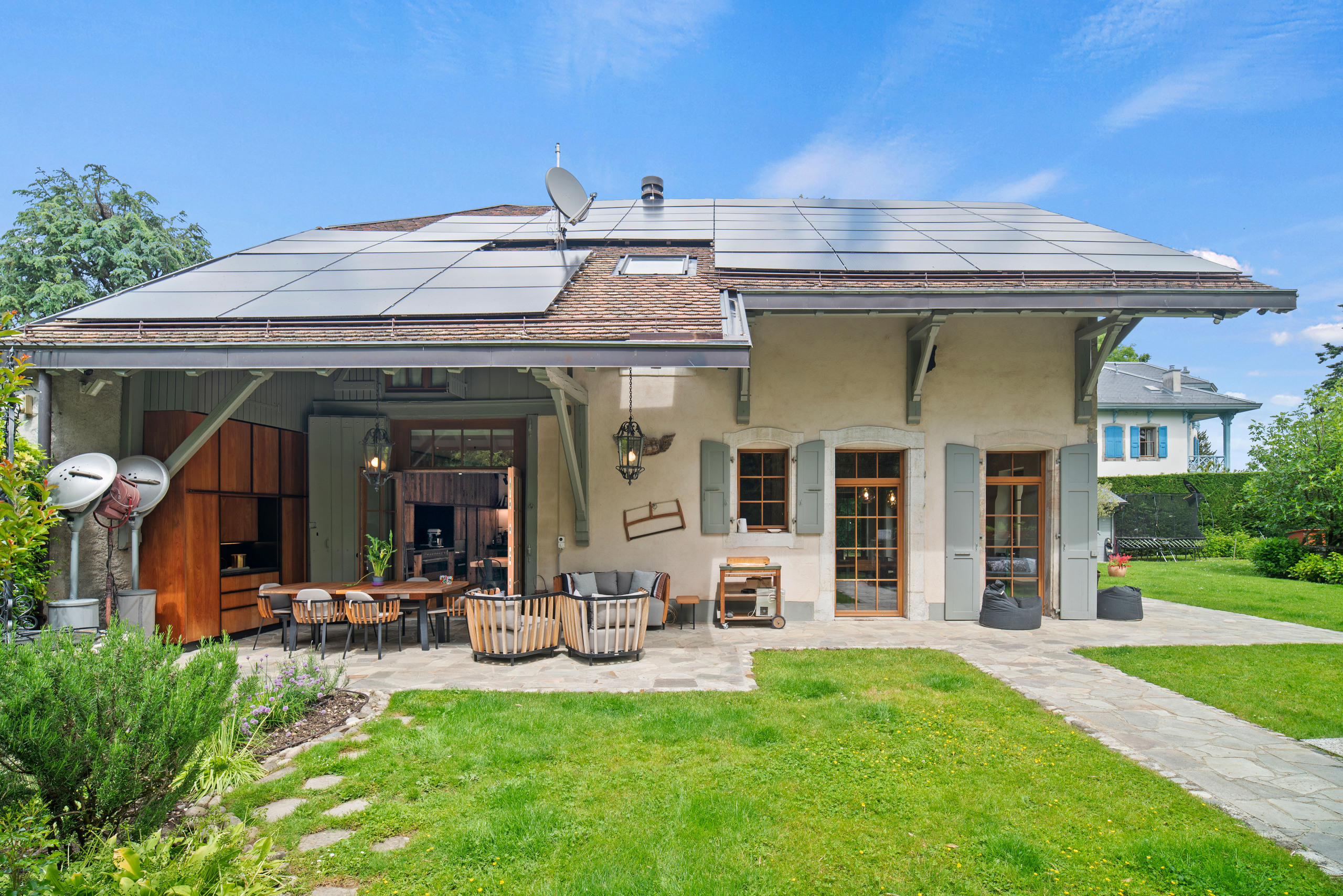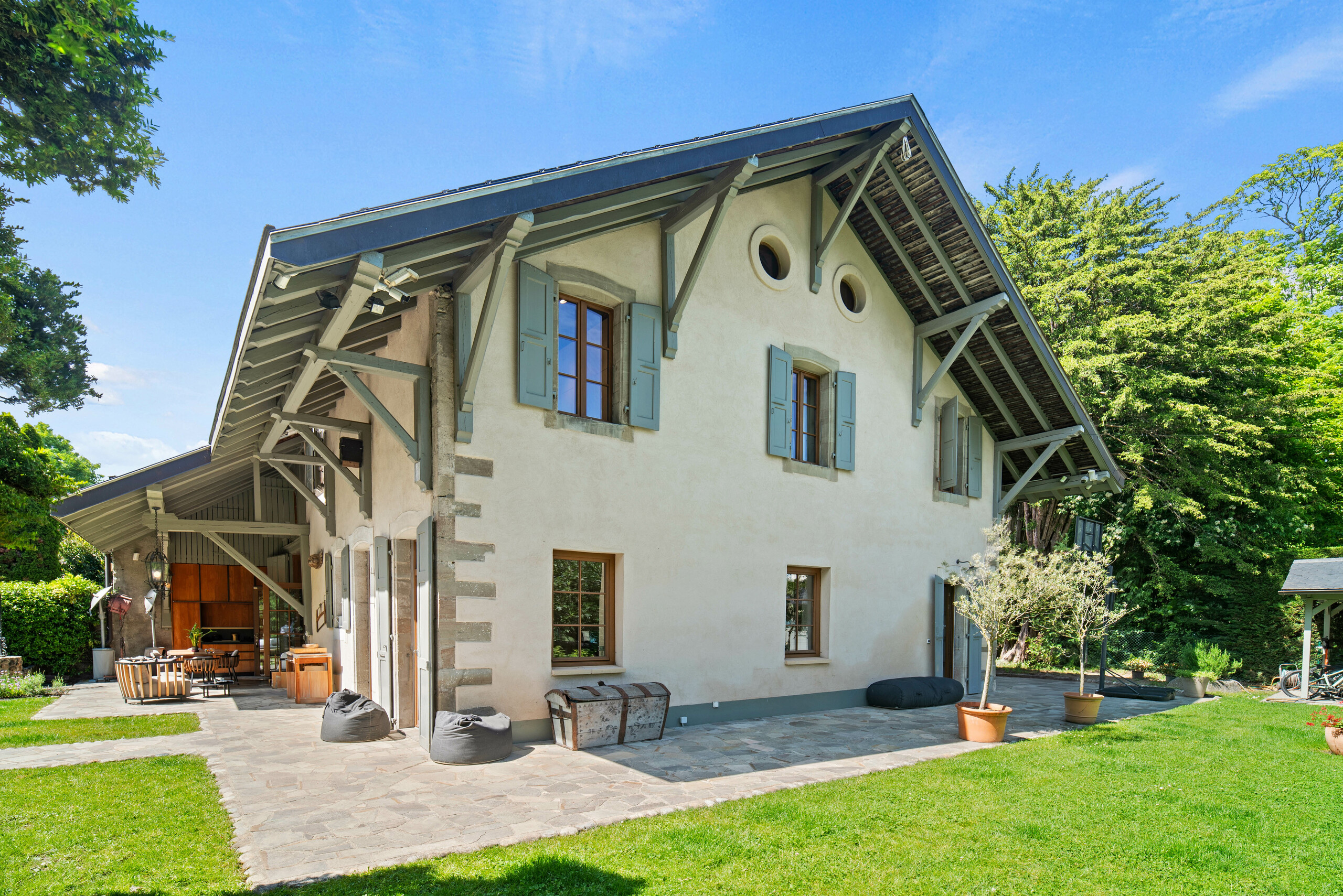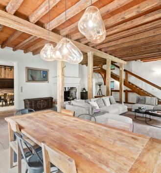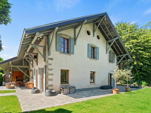 This beautiful property is located in the south of the commune of Genthod, close to transport, the airport, international schools and the lake. These old stables dating from the 18th century were renovated with great taste in 2016 and transformed into an ideal property for a family in a green environment in Geneva. The property offers all the comfort and modern technology in the very warm setting of a rural building (heat pump, solar panels, semi-professional kitchen, high-end security system, etc.) It offers a living area of approximately 350 sqm with 4 bedrooms and 3 bathrooms. Two of the bedrooms have a view onto the lake. Open to the outside, the living rooms are characterized by generous volumes with very high ceilings and lots of character (exposed beams, fireplace). The basement is fitted out with a laundry room, a wine cellar and a cinema room. The 2
