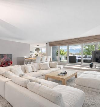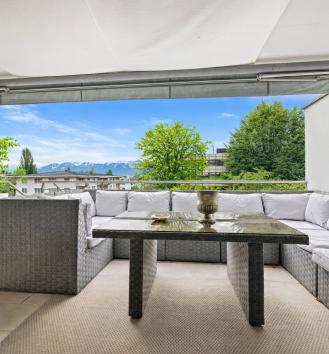 This beautiful turnkey duplex enjoys a privileged address in the heart of the highly sought-after commune of Pully. It's within walking distance of the charming center and all its amenities, the Pully-Sud train station, as well as the shores of the lake and the quays of Ouchy. The neighborhood is also appreciated for its immediate proximity to Lausanne and its excellent public transport network. The renowned Collège Champittet is just a 5-minute walk away. The 184 sqm apartment boasts contemporary, open and uncluttered architecture, with large windows and views of the Alps. Pleasant outdoor spaces extend this living space, with 32,5 sqm of balcony and terrace and a private garden of 110 sqm. The living space unfolds like a completely open plateau, offering fluid circulation between the different areas. It features a spacious living room extending onto the balcony, a fully-equipped kitchen with dining area, and a dining