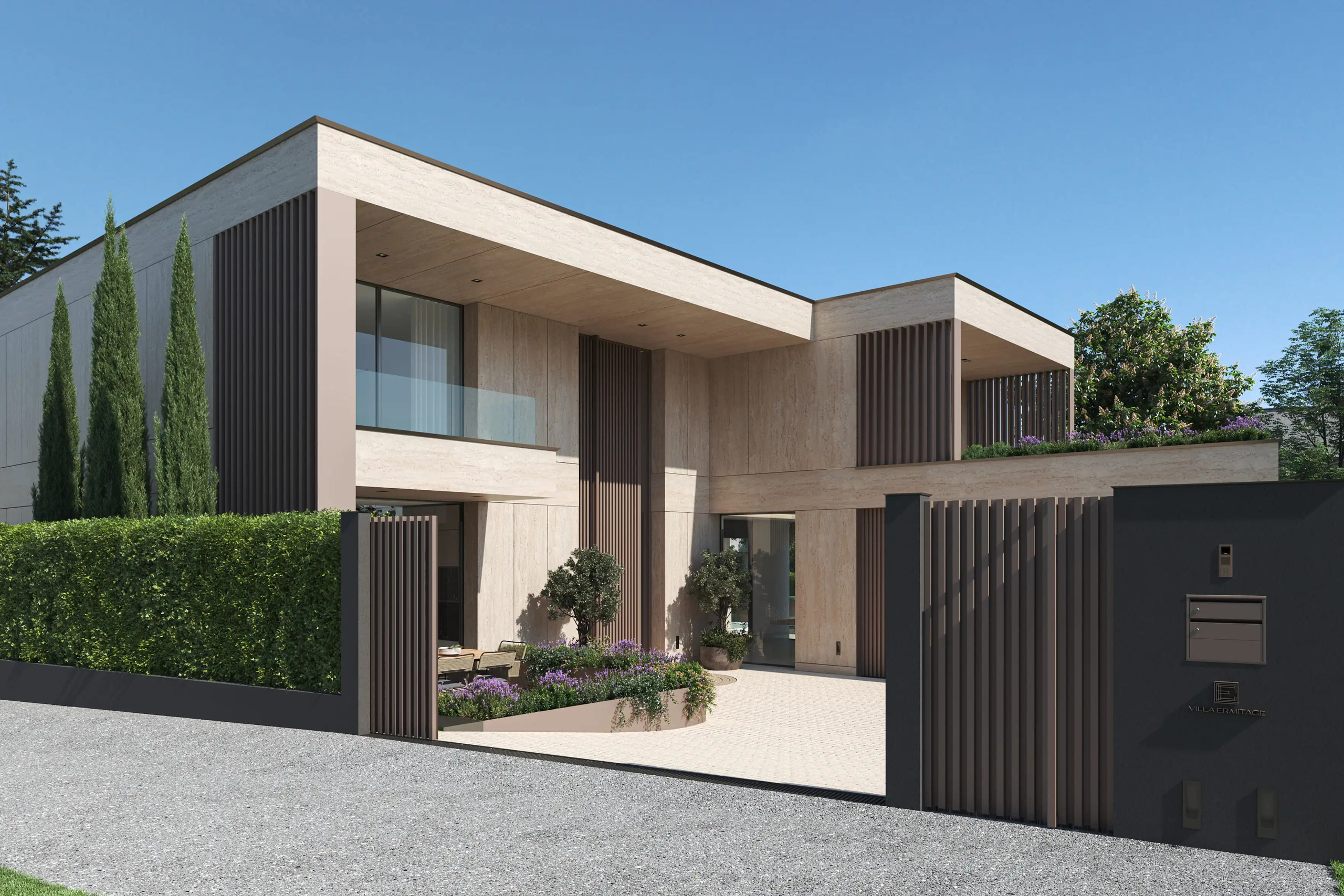 The carefully landscaped outdoor areas offer several terraces and relaxation areas in a lush, intimate setting. A garage for two vehicles and several outdoor parking spaces complete the ensemble.