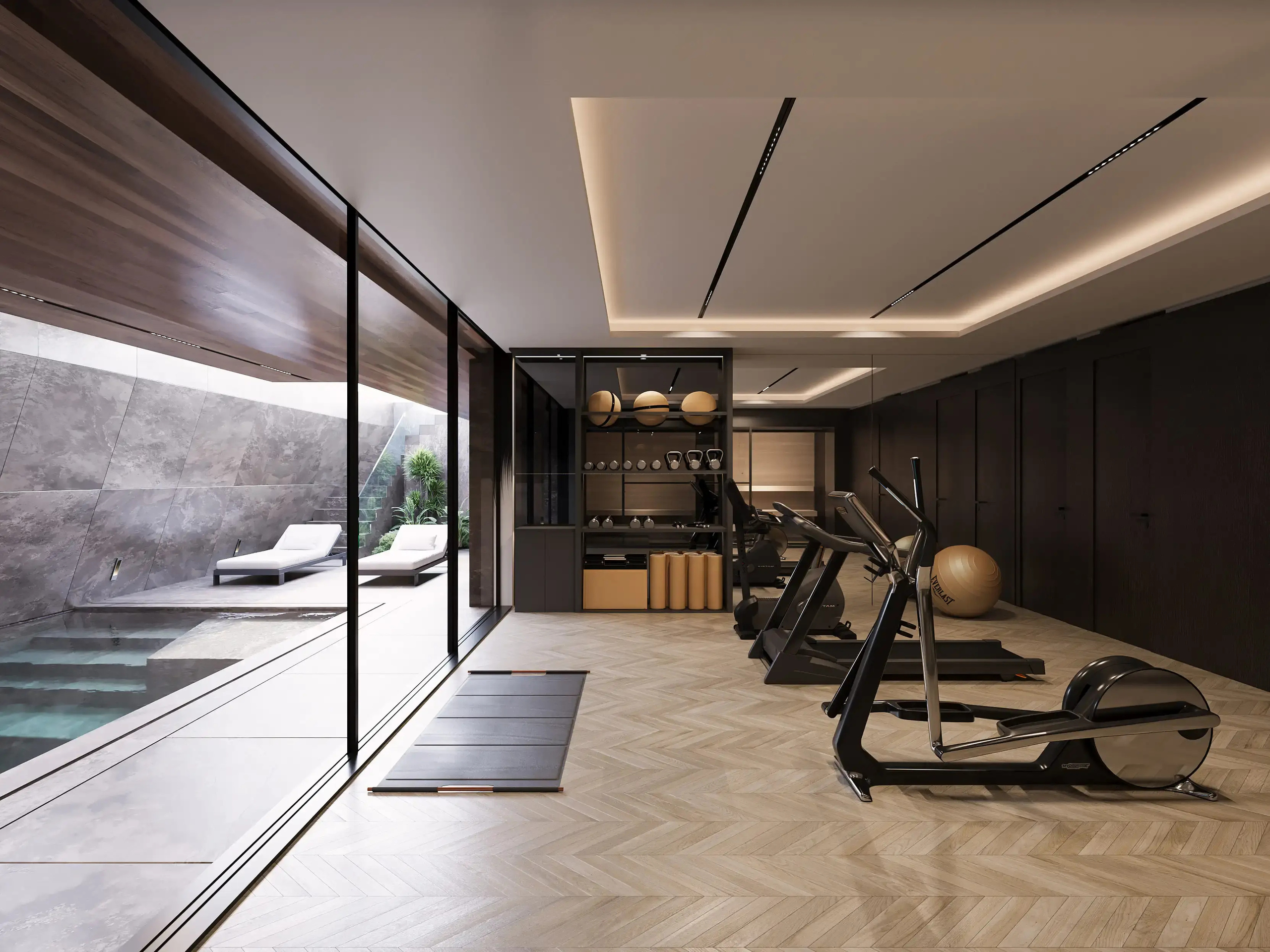 pool in natural light, with a staircase giving direct access to the terrace, a gym, a relaxation area with sauna and hammam, a home cinema, a games room and an air-conditioned wine cellar.