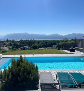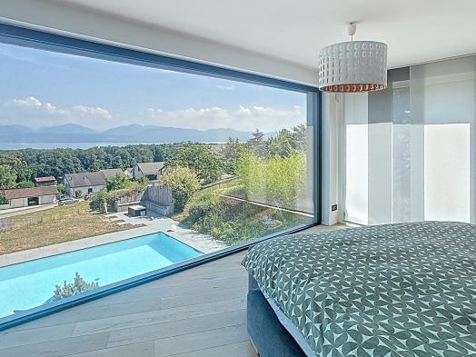 Built in 2016, this magnificent contemporary villa combines elegance, comfort and modernity. Nestled in a very quiet residential area, it enjoys breathtaking views of the lake and the Alps. Built on a beautiful landscaped plot of 1,485 sqm, the property offers an idyllic living environment with its heated outdoor swimming pool, large south-facing terrace and fire pit area , the perfect place to admire the view while enjoying the peaceful, green surroundings. The villa's modern architecture highlights its generous and bright spaces, designed to meet the needs of a family. The interior exudes a warm, inspiring and intimate atmosphere. Ideally located close to international schools, shops and transport links, the property enjoys a peaceful yet strategic location. The 345 sqm of living space is spread over two levels and a fully heated lower ground floor. The living areas, which open onto the south thanks to large