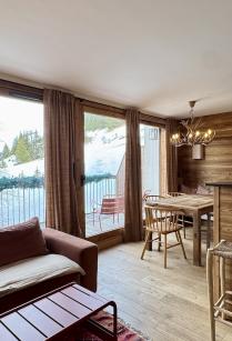 Situé au Domaine de l’Ariondaz à Courchevel Moriond, skis aux pieds, ce charmant duplex décoré avec goût se compose au premier niveau d’une entrée avec rangements, un wc invité, un séjour avec cuisine ouverte entièrement équipée, une terrasse.