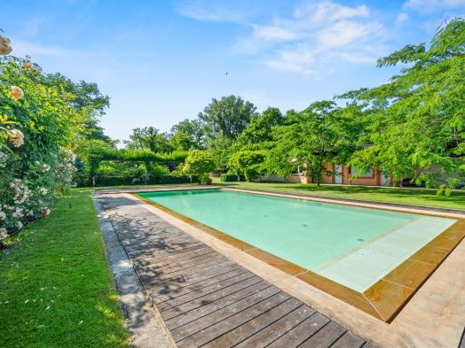 Nichée au bout d’une allée privée, cette propriété discrète bordée par une rivière s’inscrit dans un écrin de verdure d’environ 20'000 m² mêlant prairies, bois, étangs, roseraies, palmiers et autres essences variées. Ce cadre naturel exceptionnel accueille une maison de plain-pied construite dans les années 1960, et rénovée en 2010 puis en 2016, ainsi que plusieurs dépendances. La demeure principale développe environ 400 m² habitables pour 580 m² utiles. Organisée autour de deux bâtiments en L proches de la piscine, elle propose de vastes pièces de réception — salons, salles à manger, véranda — largement ouvertes sur les terrasses et le parc. La partie nuit comprend six chambres, dont une grande suite parentale avec deux salles de bains, deux dressings et un salon privé. Le sous-sol abrite une buanderie, un dressing, une cave à vin, des espaces de rangement, les locaux techniques et un espace fitness avec accès