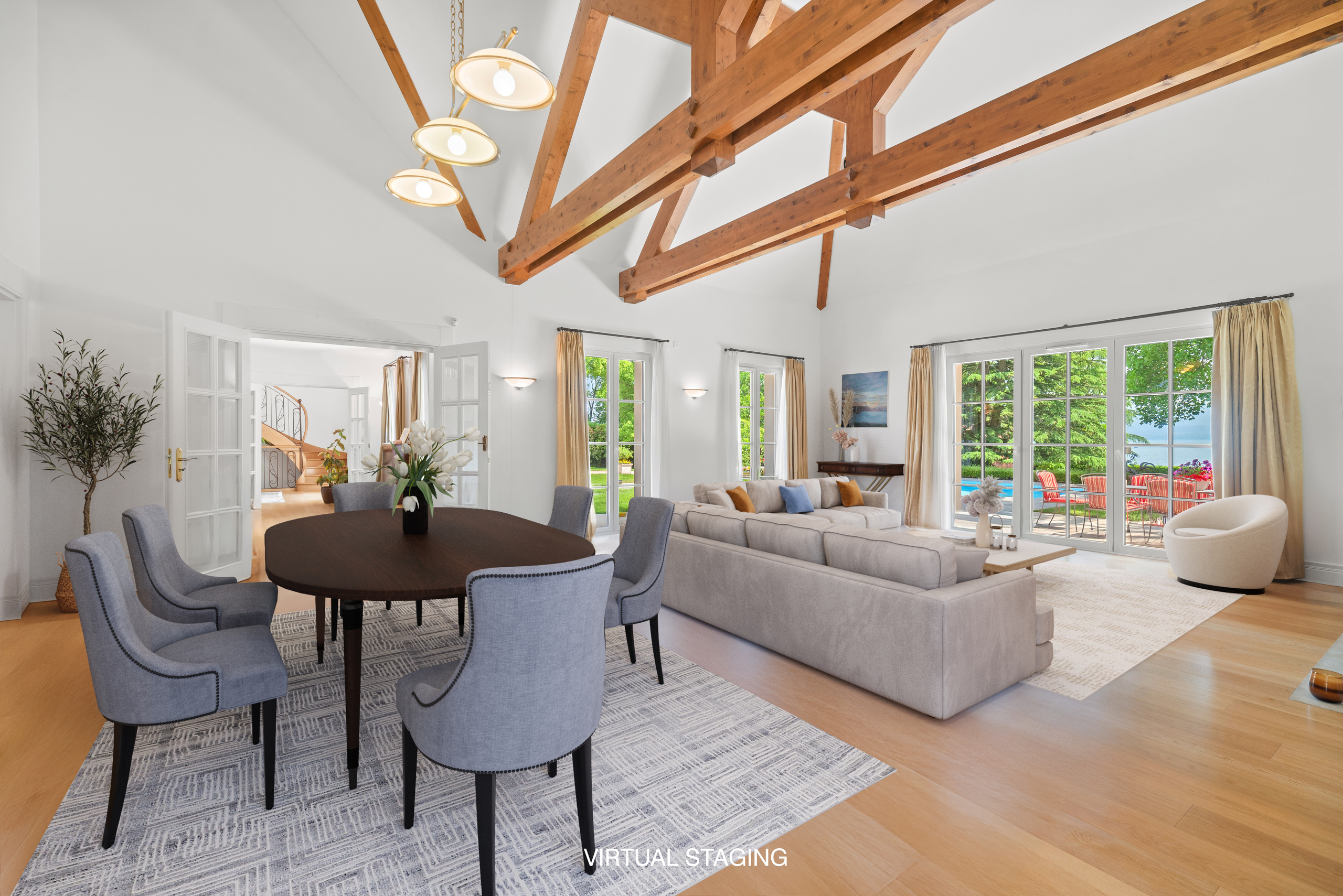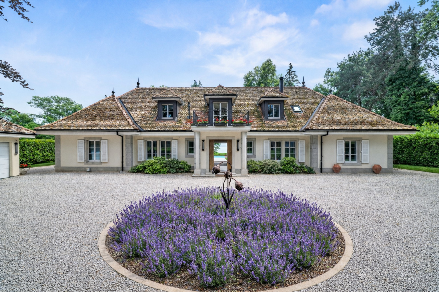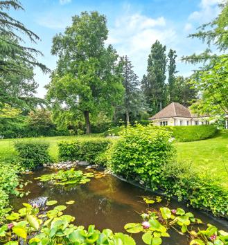 soin particulier est apporté au magnifique jardin avec diverses essences d’arbres et un joli étang. La propriété bénéficie d'un accès direct et sécurisé au lac, agrémenté par un garage à bateau et un ponton privé.