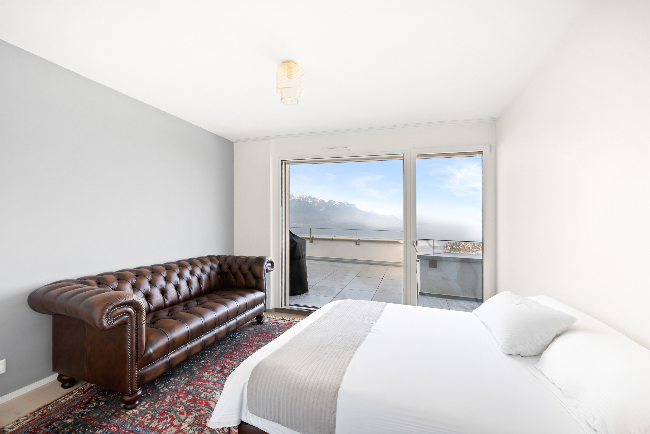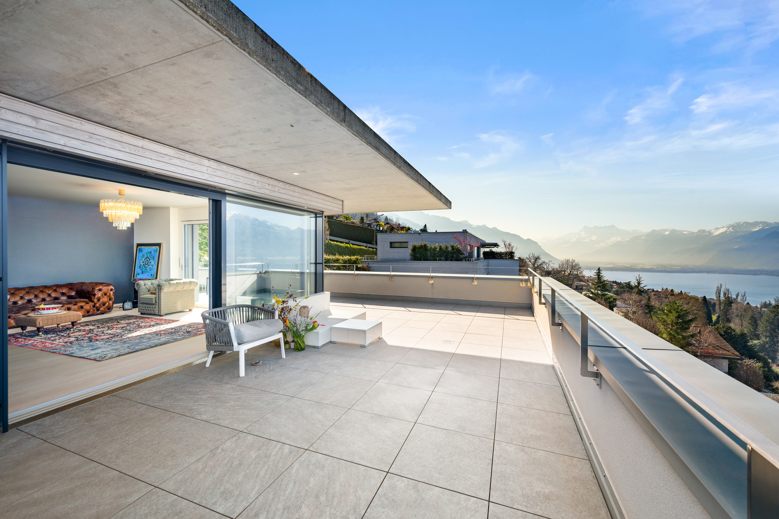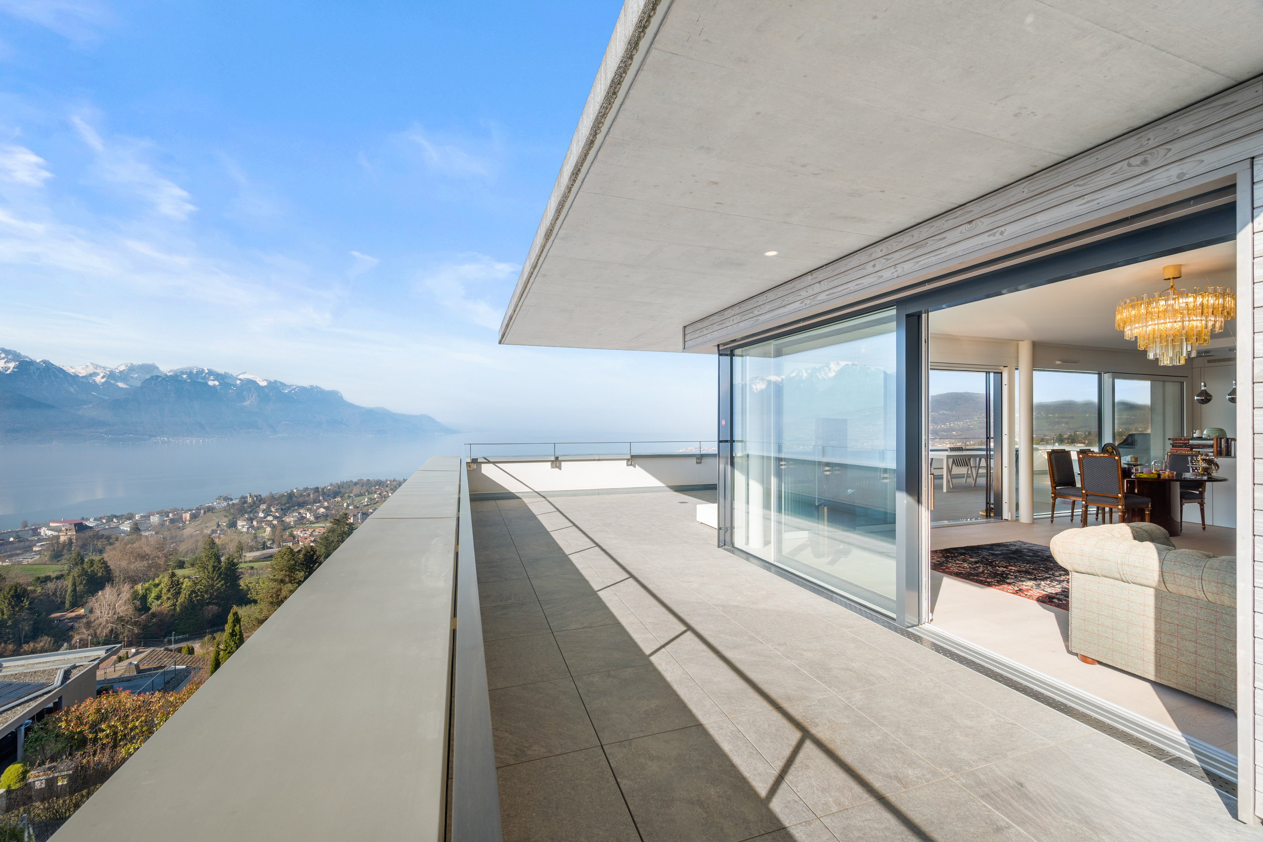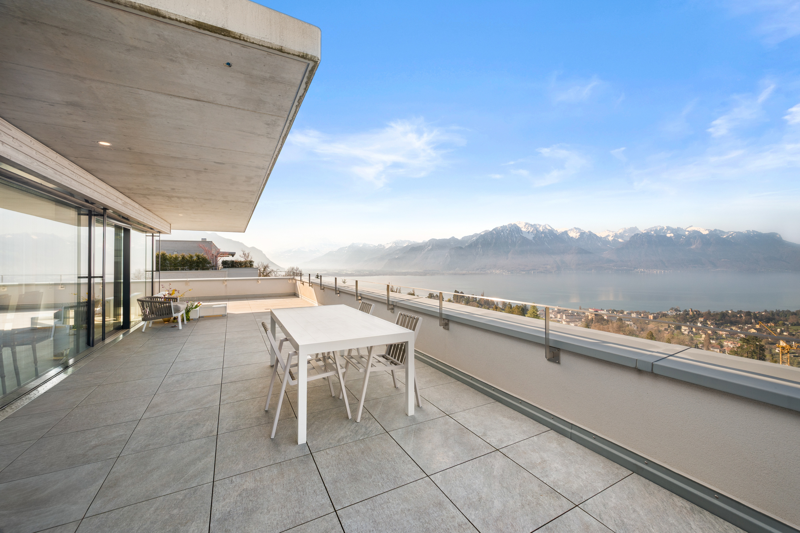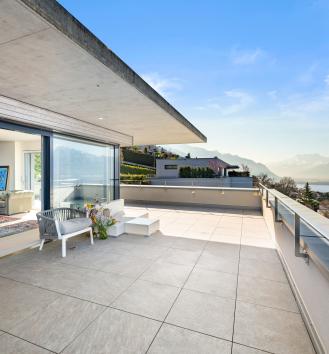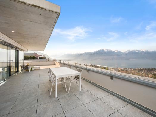 Situé sur les hauteurs de Montreux, dans un quartier résidentiel prisé, ce superbe appartement contemporain aux finitions luxueuses bénéficie d’une vue panoramique exceptionnelle sur le lac Léman et les Alpes. Construit en 2020, l’immeuble offre des prestations de grande qualité. L’appartement séduit par ses volumes généreux, sa luminosité remarquable et une distribution des espaces parfaitement pensée. Idéalement localisé, il se trouve à proximité immédiate d’une gare, des commerces ainsi que des nombreuses activités ludiques et nautiques de la région. Un bien clé en main, alliant confort et élégance. D’une surface habitable d’environ 130 m², l’appartement est prolongé par une vaste terrasse de 116 m², véritable belvédère offrant un spectacle unique sur le lac. Les espaces de vie, tous orientés plein sud, comprennent un vaste séjour avec accès direct à la terrasse, ainsi qu’une cuisine ouverte entièrement équipée, réalisée avec des matériaux de standing. L’ensoleillement est optimal