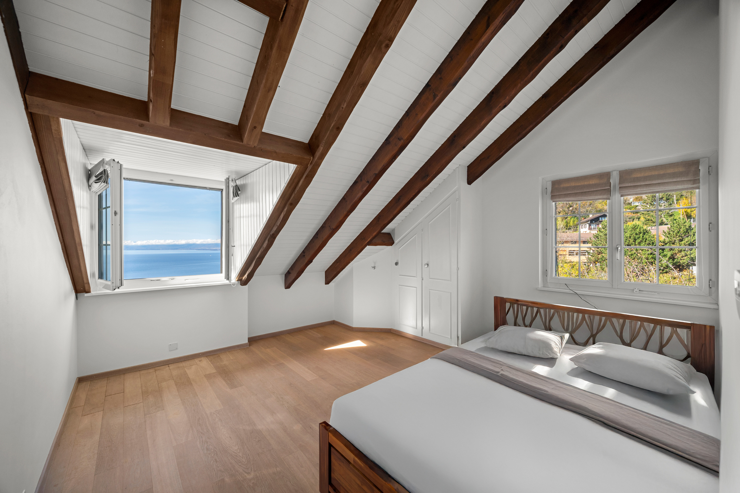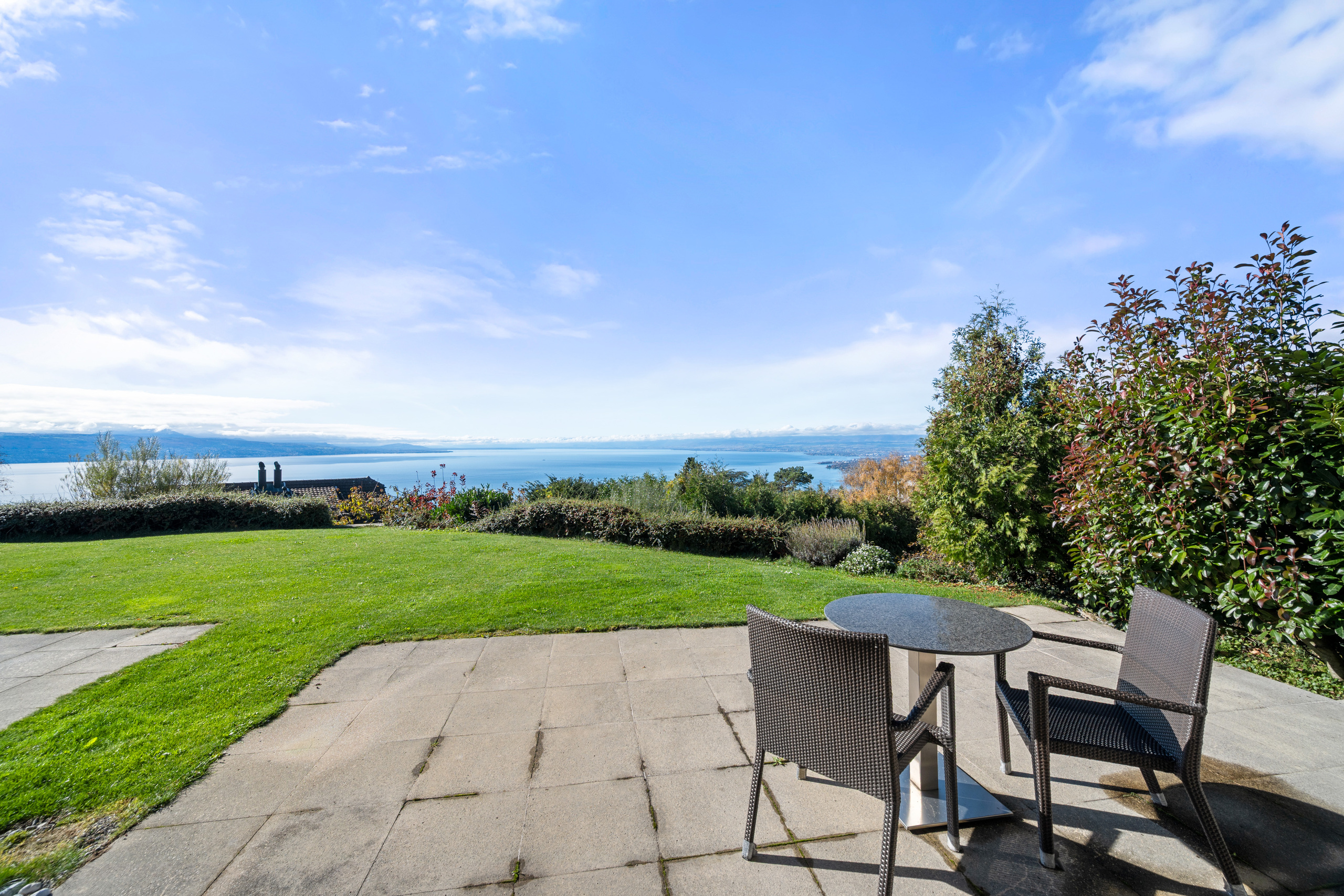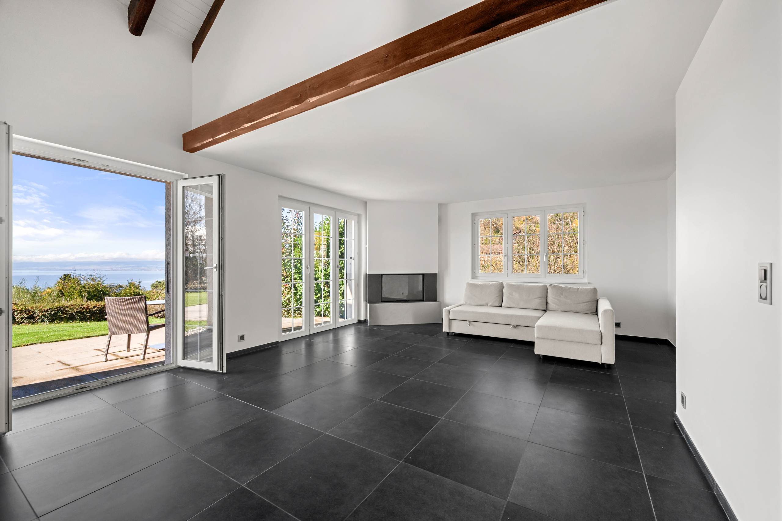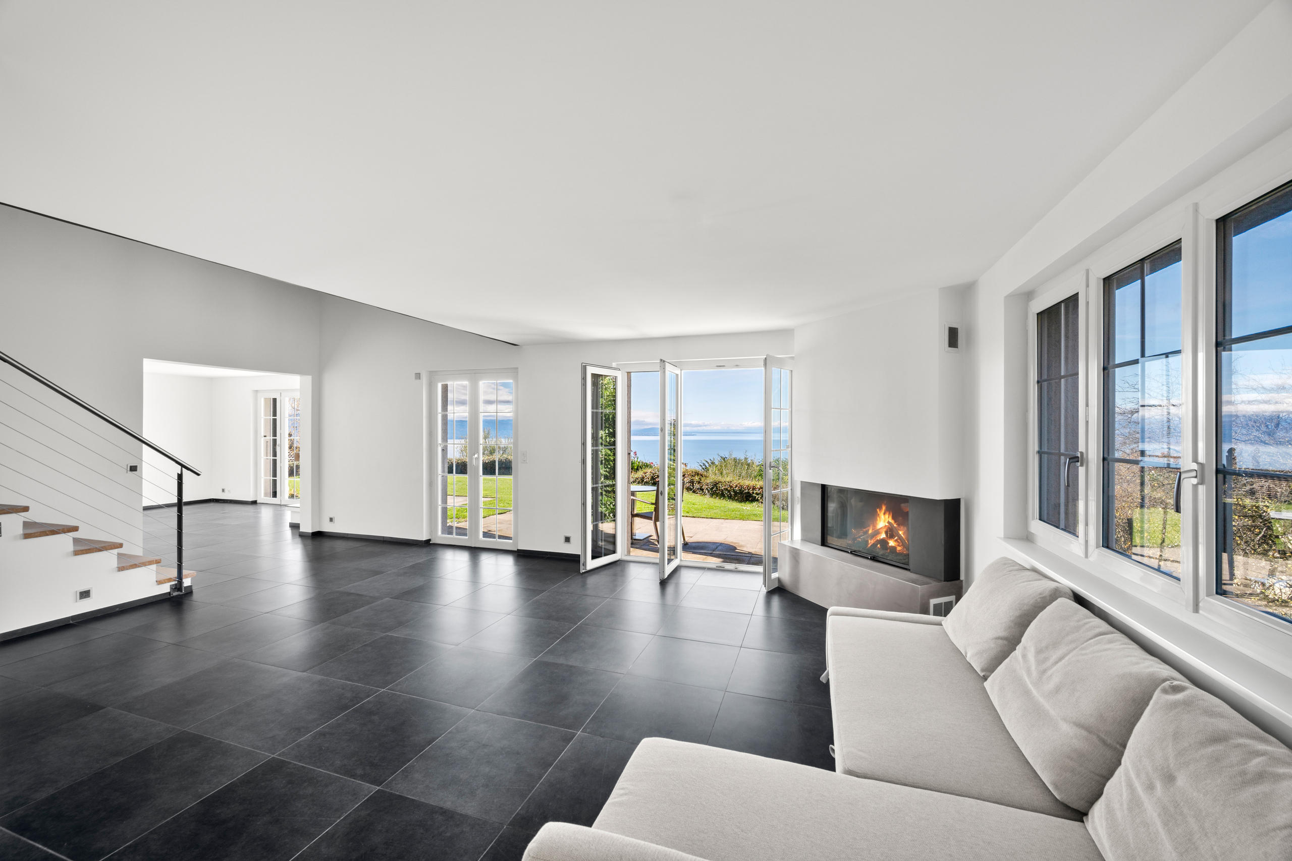 Cette magnifique propriété, construite en 1987 et entièrement rénovée avec soin en 2021, se situe dans un quartier résidentiel prisé. Implantée sur une parcelle de 1'328 m² en position dominante, elle offre une vue spectaculaire sur le lac et les Alpes. Alliant avec harmonie charme et confort, elle dispose de belles pièces de réception baignées de lumière grâce à son exposition plein sud. Proche des transports publics, des commerces et des écoles internationales, elle répond parfaitement aux attentes d’une famille. La maison offre une surface habitable d’environ 320 m² répartie sur deux niveaux, complétée par un vaste sous-sol. Les espaces de vie sont spacieux, agrémentés d’une cheminée, et s’ouvrent sur la terrasse et le jardin. La cuisine moderne, entièrement équipée, allie esthétisme et fonctionnalité. Ce niveau comprend également un bureau, un WC visiteurs ainsi qu’une chambre avec salle de bain attenante. À l’étage, une grande mezzanine dessert