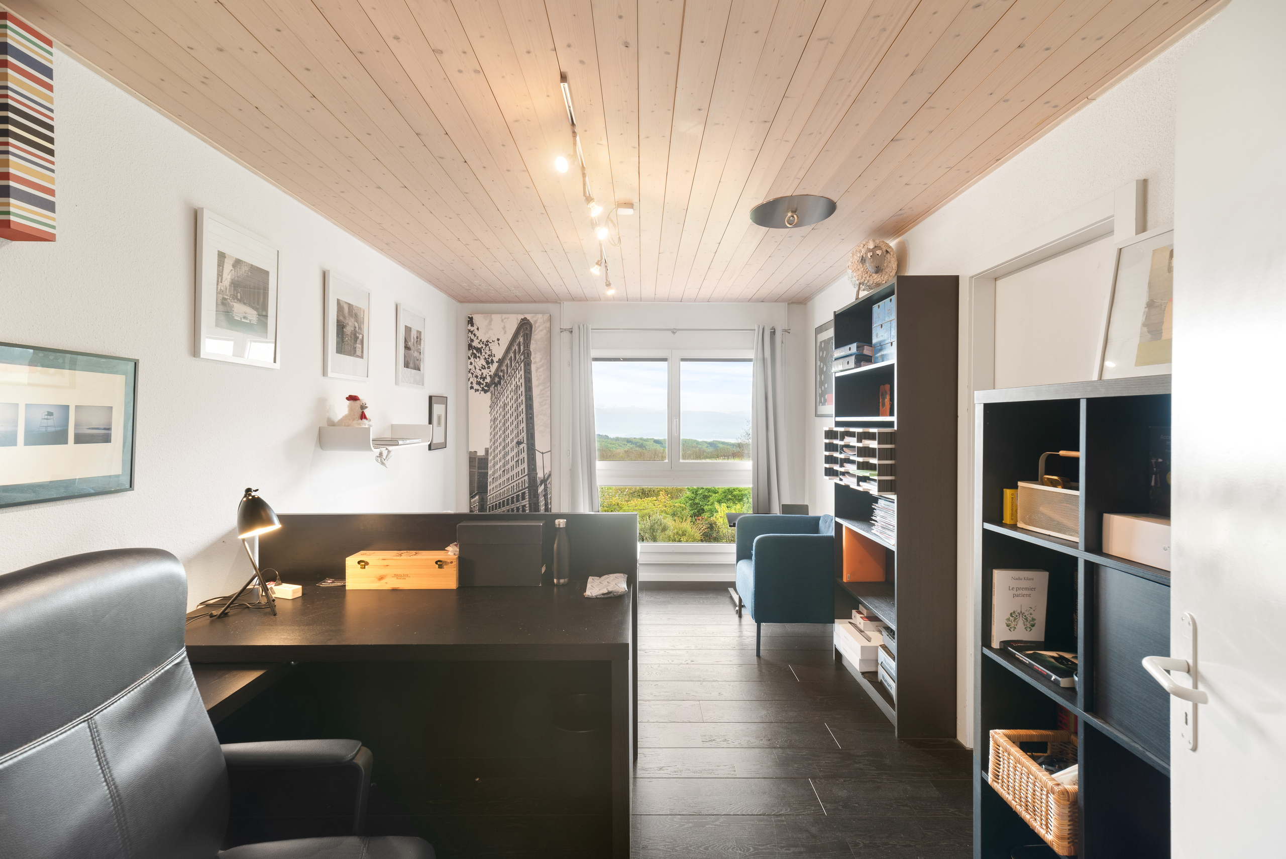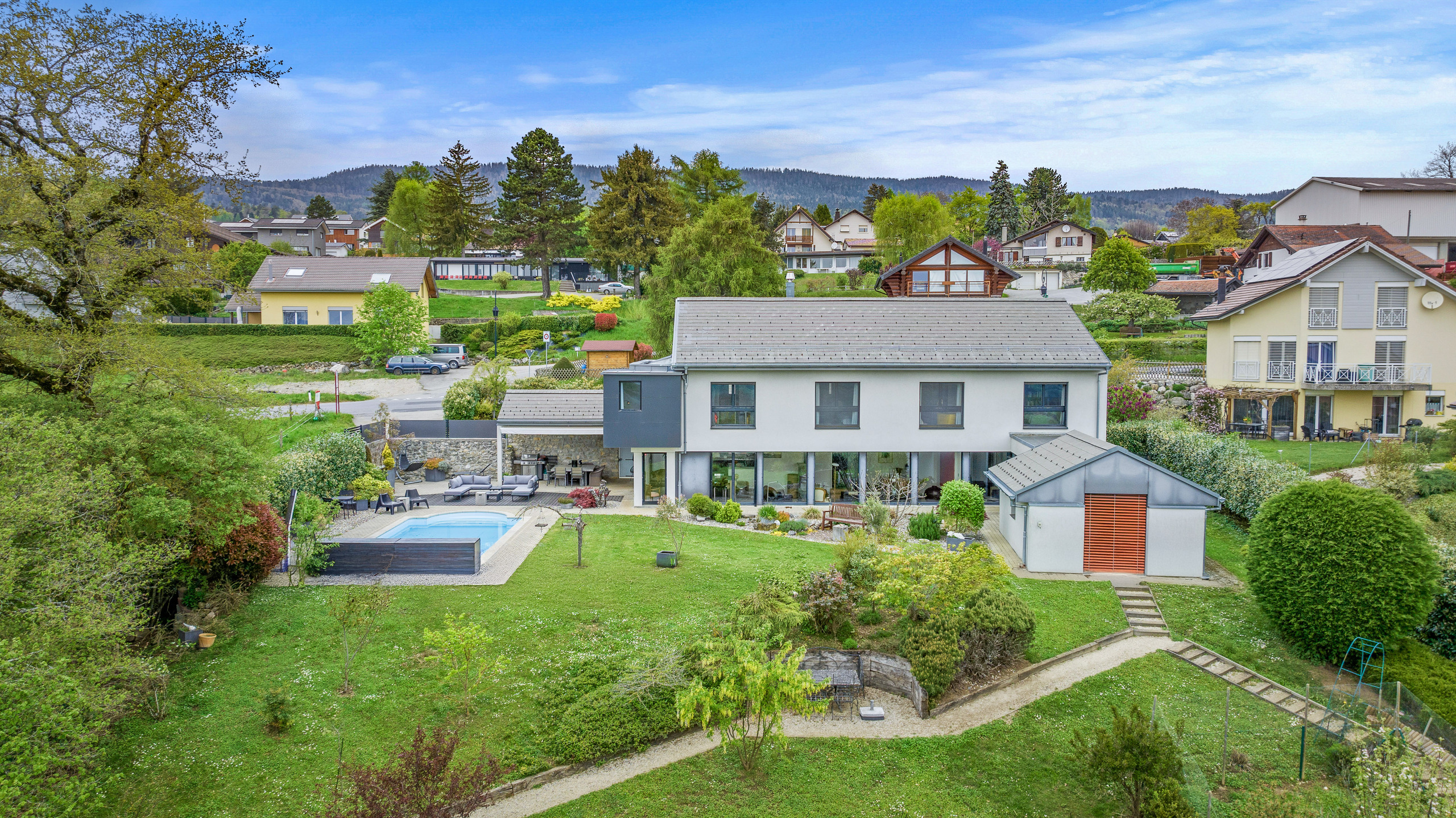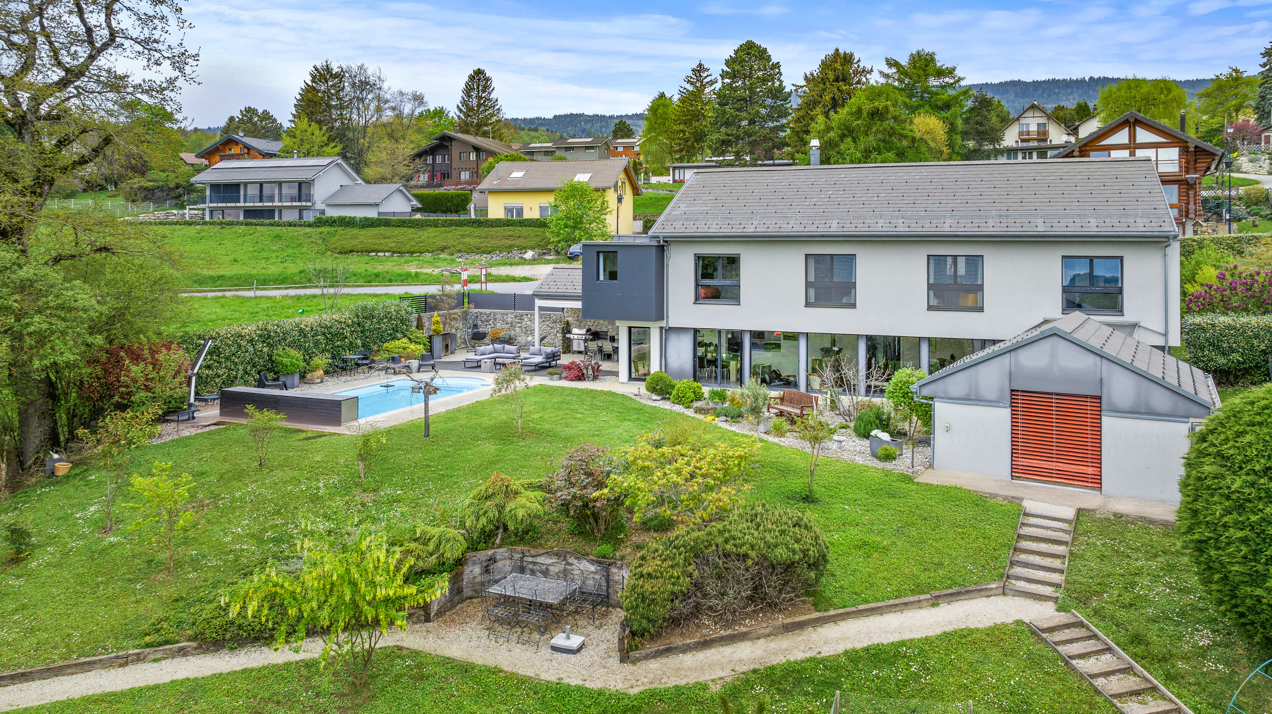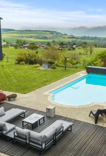 Cette superbe maison familiale de style contemporain a été construite en 2001 et offre une vue dégagée sur la campagne environnante, le Lac et les Alpes. Située en bordure de village, elle permet d'accéder rapidement aux commerces et bénéfiecie d'un environnement calme et bucolique. La maison de 330 m2 a été construite sur une parcelle de plus de 1400m2 de manière a profiter toute l'année du jardin et de la terrasse. Très agréables à vivre avec une circulation fluide, chacun des deux niveaux offre de beaux espaces; au rez de jardin, on peut profiter de plusieurs salons, d'une salle de billard et d'un joli bureau. La cuisine s'ouvre sur une belle salle à manger et sur la pergola qui abrite salle à manger d'été ouverte sur une grande terrasse et la piscine. L'étage accueille une grande suite parentale, trois chambres d'enfants, un bow-window avec un espace