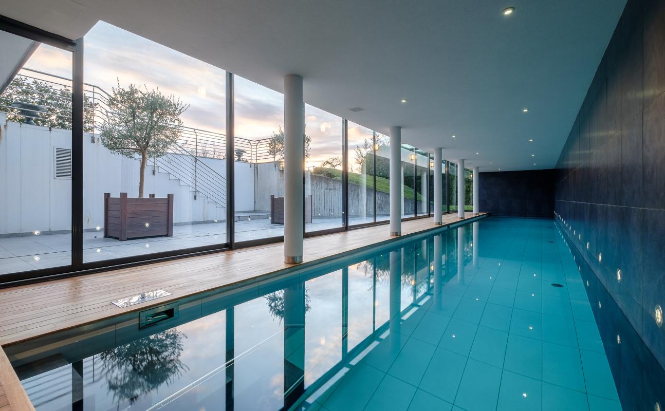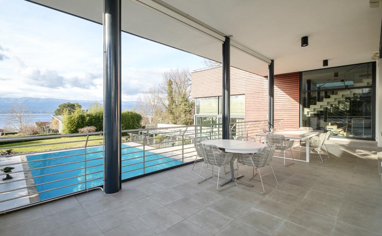 Villa contemporaine, piscine intérieure, vue lac, Cologny