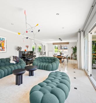 Built in 1960 on a 1,292 sqm plot and regularly renovated, notably in 2012 and 2022, the property offers approximately 400 sqm of living space. Its well-thought-out layout and high-quality finishes make it a functional and very pleasant family home. On the ground floor, the generous entrance hall leads to two living rooms separated by a double-sided fireplace, as well as the dining room, all of which open extensively onto the terrace and garden. The large, fully equipped kitchen, a true living space, opens onto the dining area. A bar on the living room side enhances conviviality and provides a direct view of the kitchen. A study and guest lavatory complete this level. The first floor hosts two spacious bedrooms with a shared bathroom, as well as an elegant master suite featuring a large dressing room and a generous bathroom with bath and shower. The basement includes
