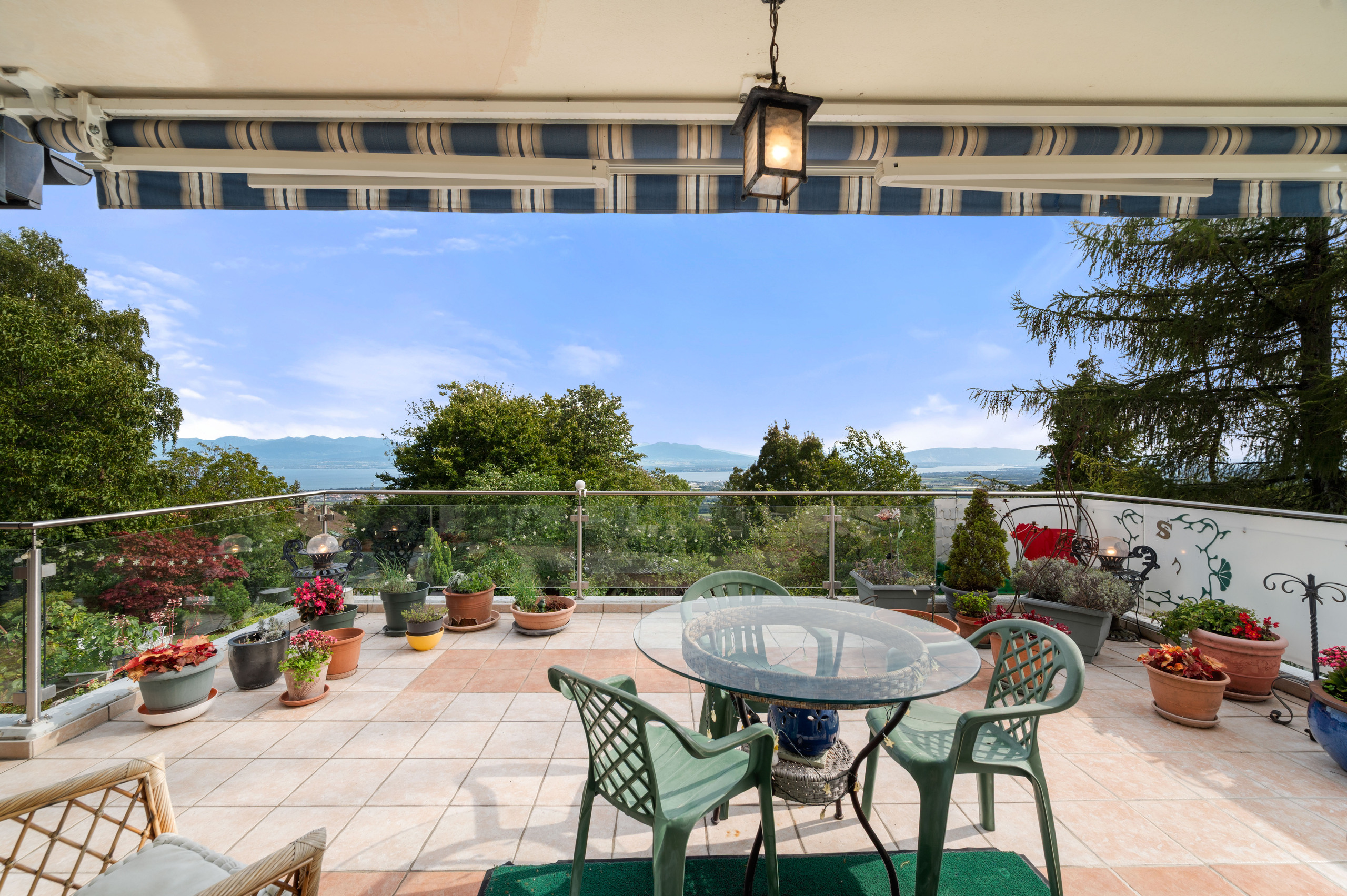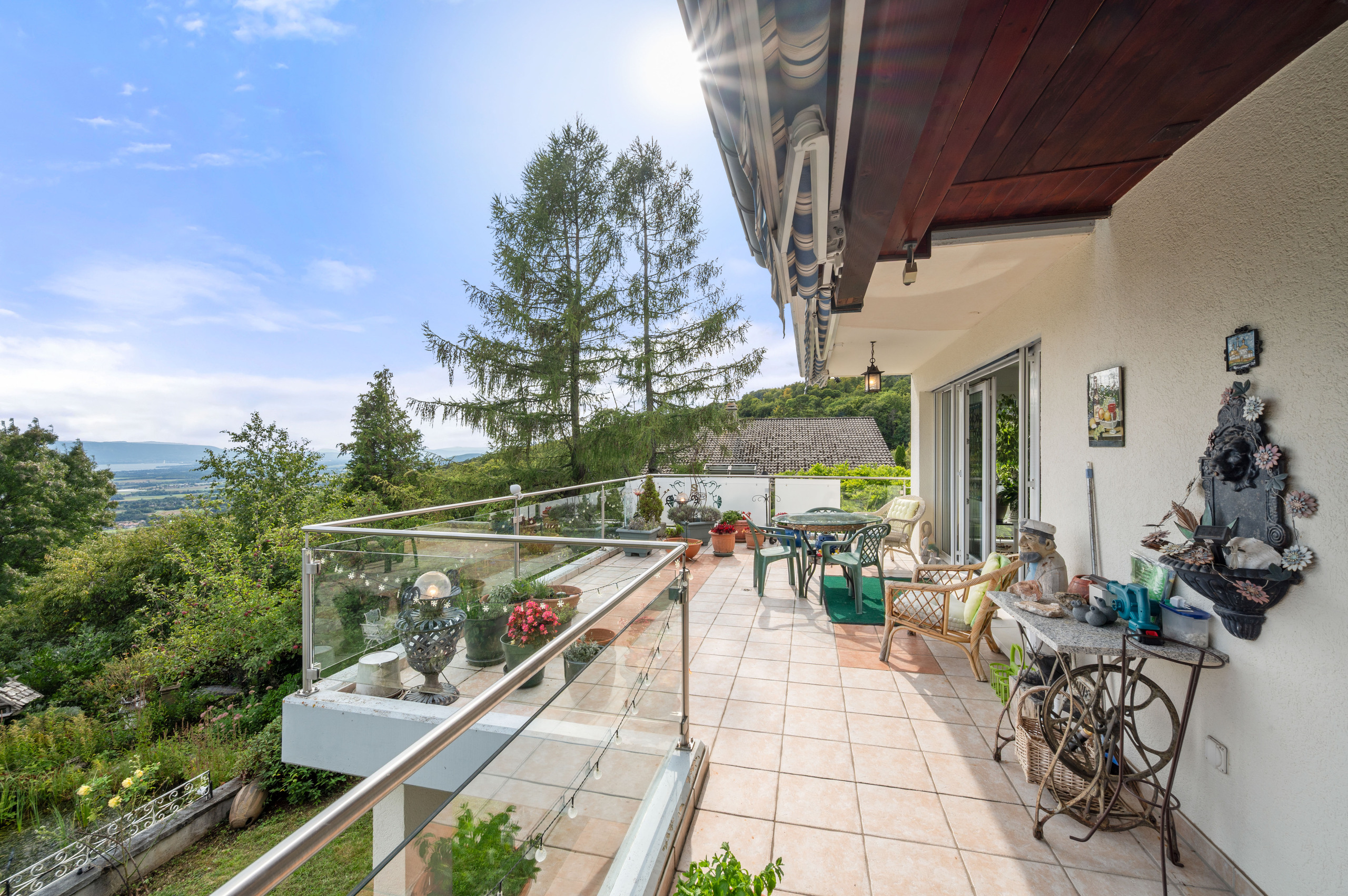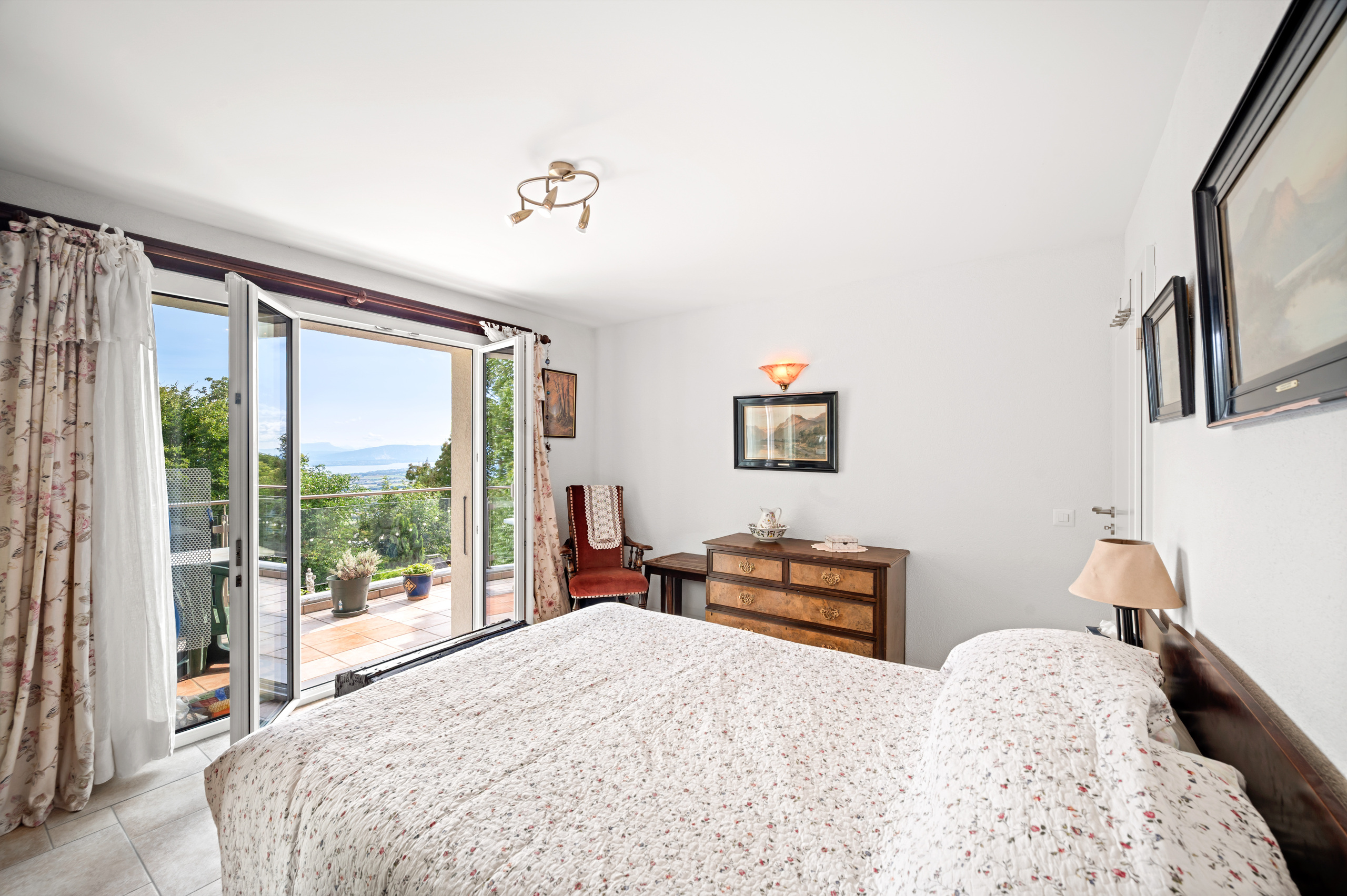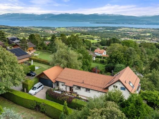 Situated in the sought-after heights of Arzier-Le Muids, this elegant 320 sqm detached house combines family comfort, generous living space and exceptional views. Surrounded by 1,169 sqm of landscaped grounds, it offers a rare quality of life between lake and mountains. As soon as you enter, you will be seduced by the spacious, light-filled, south-east-facing living area, comprising a lounge with fireplace, a convivial dining room and a fully fitted and equipped open-plan kitchen with pantry. The whole opens onto a panoramic terrace with uninterrupted views of Lake Geneva and Mont Blanc. Two beautiful bedrooms, a study area and a bathroom complete this level. Upstairs, a superb master suite with bathroom, balcony and attic storage offers a warm, intimate atmosphere. The lower ground floor features a basement with a separate living area ideal for family, guests or staff, including a lounge, open-plan kitchen, three bedrooms and three