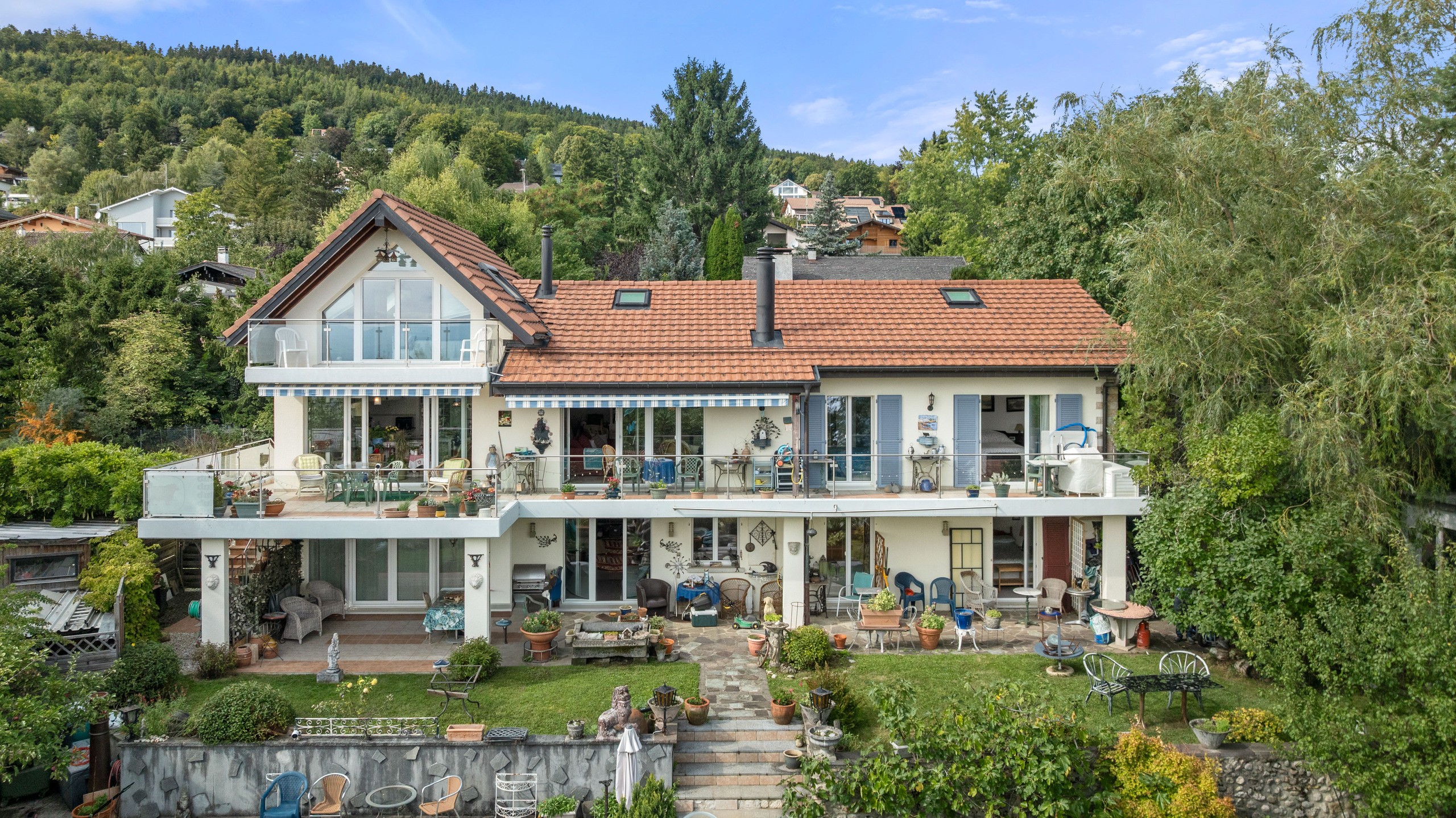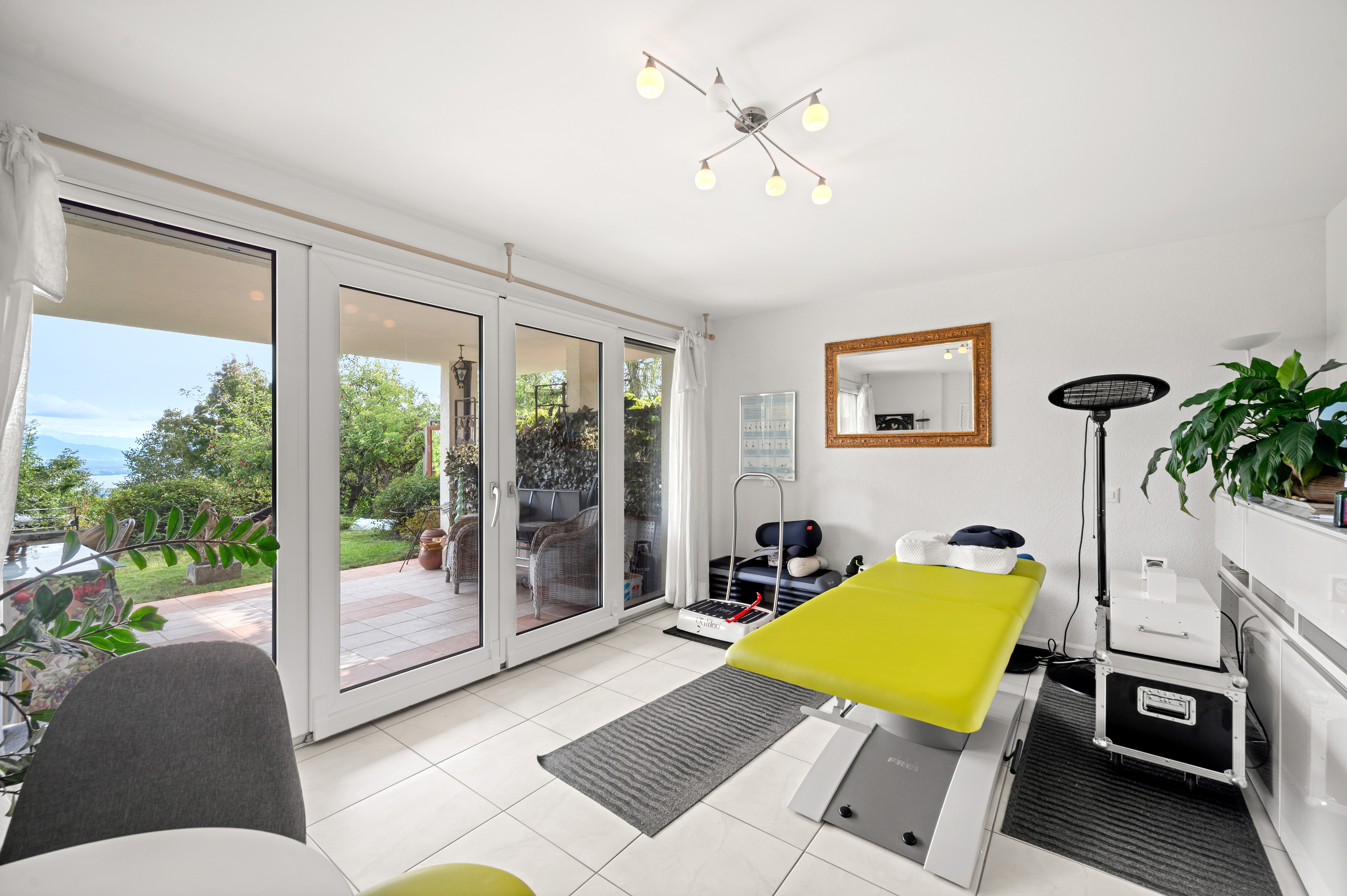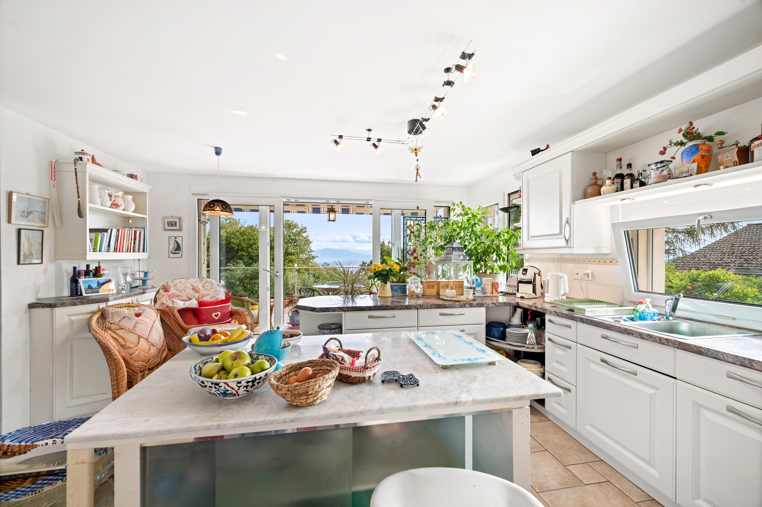 Situated in the sought-after heights of Arzier-Le Muids, this elegant 320 sqm detached house combines family comfort, generous living space and exceptional views. Surrounded by 1,169 sqm of landscaped grounds, it offers a rare quality of life between lake and mountains. As soon as you enter, you will be seduced by the spacious, light-filled, south-east-facing living area, comprising a lounge with fireplace, a convivial dining room and a fully fitted and equipped open-plan kitchen with pantry. The whole opens onto a panoramic terrace with uninterrupted views of Lake Geneva and Mont Blanc. Two beautiful bedrooms, a study area and a bathroom complete this level. Upstairs, a superb master suite with bathroom, balcony and attic storage offers a warm, intimate atmosphere. The lower ground floor features a basement with a separate living area ideal for family, guests or staff, including a lounge, open-plan kitchen, three bedrooms and three