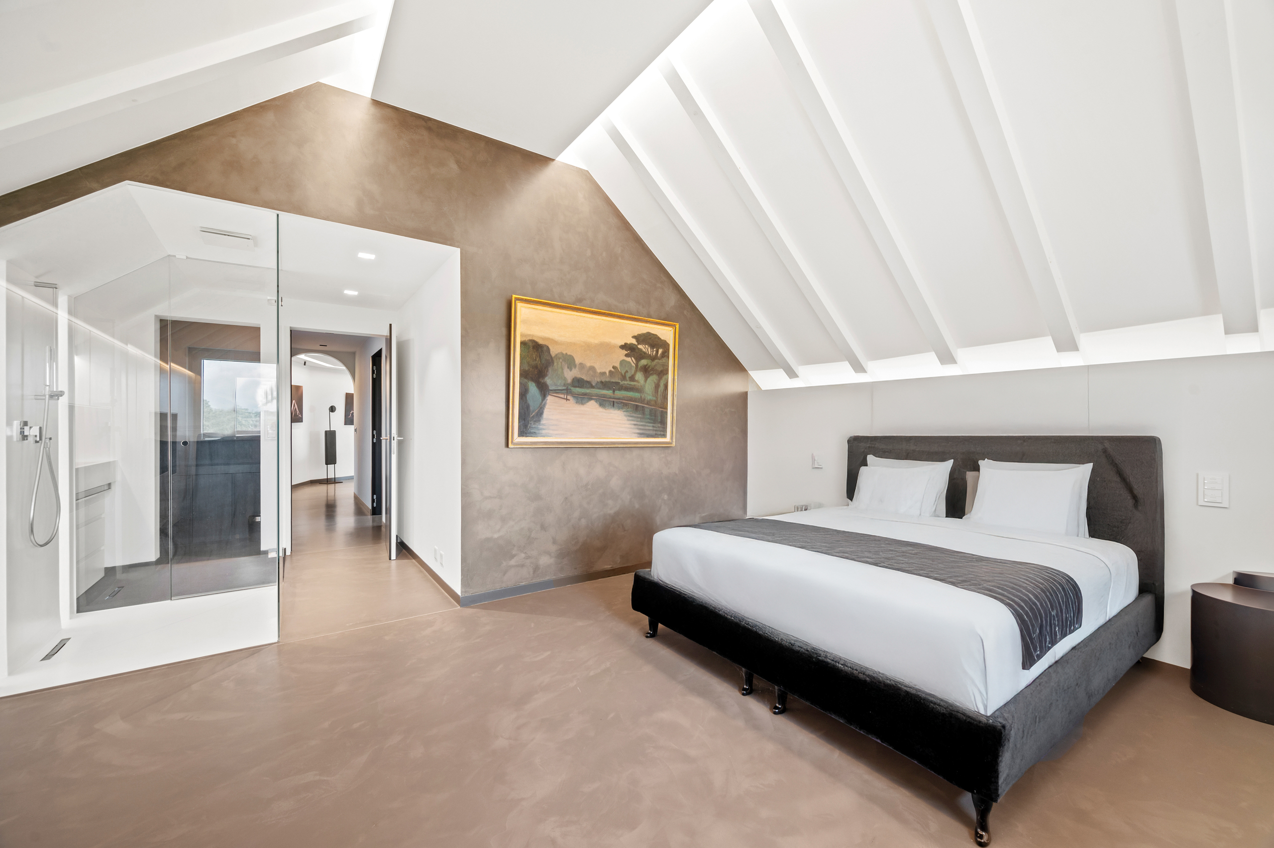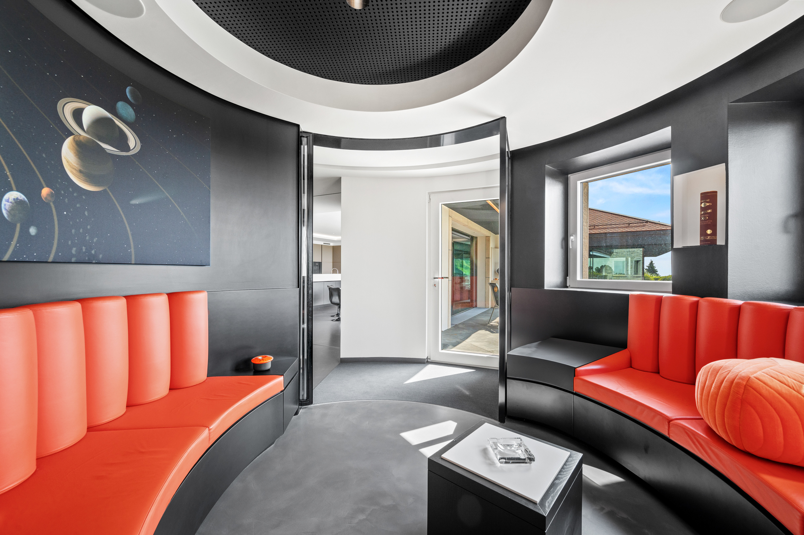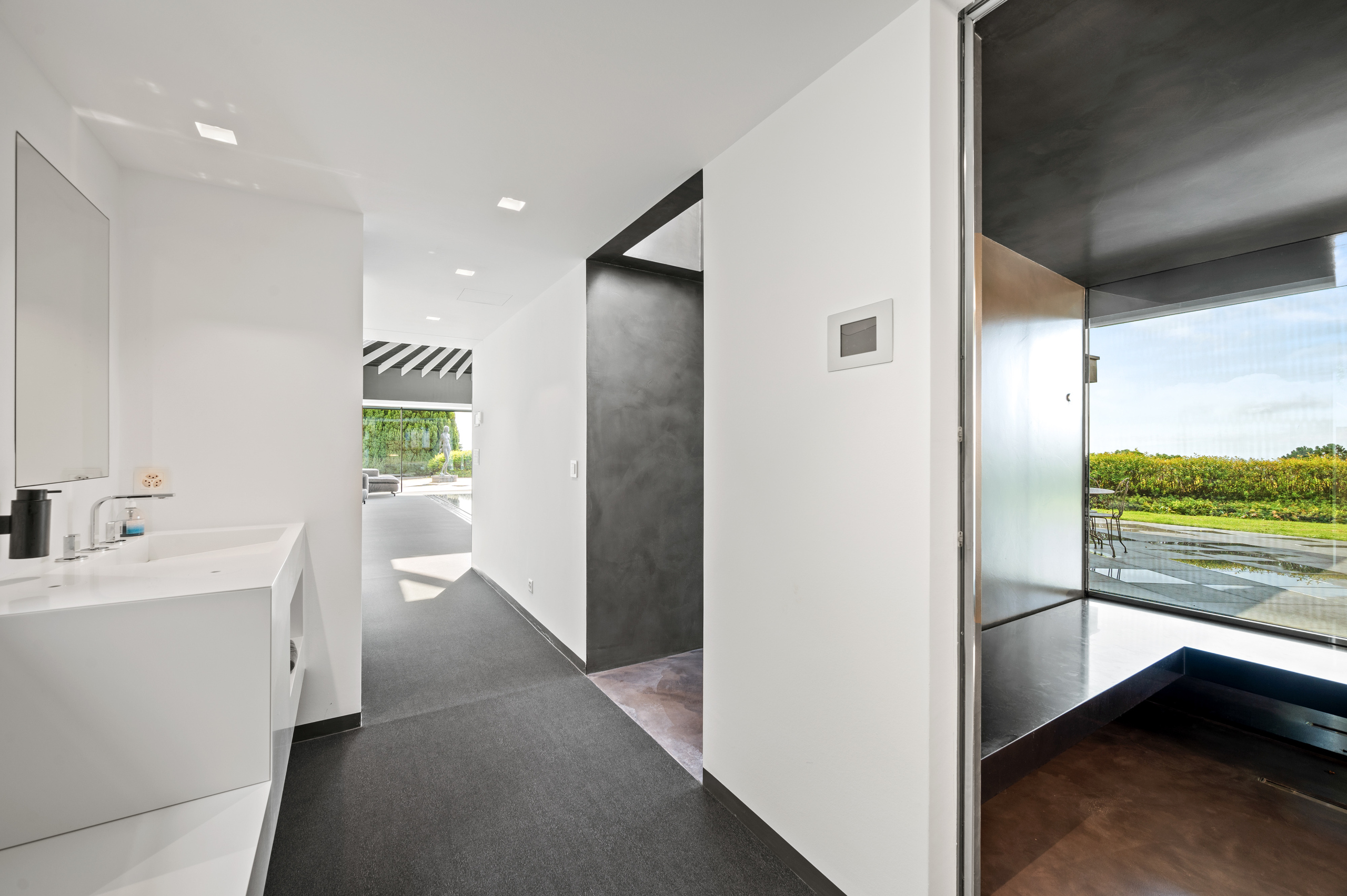 The basement is decidedly exclusive: a glass-fronted, air-conditioned wine cellar, secure bunker, home cinema, cellar and technical rooms are laid out in a practical and refined manner.