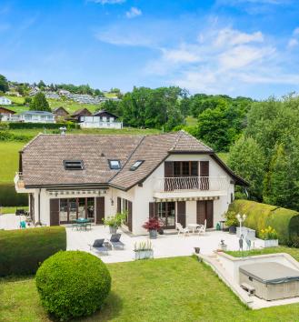 Dominant le bassin lémanique et située dans un écrin de verdure, cette propriété marie avec subtilité et charme l’architecture traditionnelle et des aménagements pensés pour une vie familiale paisible. Offrant une vue imprenable sur les Alpes et le lac, elle séduira les amateurs de sérénité et de panoramas d’exception. Venez découvrir cette superbe propriété d’une surface habitable d'environ 270 m² composée au rez-de-chaussée d'un vaste séjour lumineux, un sublime salon et son ambiance chaleureuse, une cuisine indépendante entièrement aménagée et équipée. Au 1er étage, deux chambres offrent confort et intimité, complétées par une salle de bains et un WC séparé ainsi qu'une master généreuse avec sa salle de bains attenante. Le sous-sol réserve : un studio indépendant, idéal pour des invités ou un espace professionnel, ainsi qu’une chaufferie, une cave, atelier, et un grand double garage. À l’extérieur, un terrain de 1326m2 et une grande terrasse