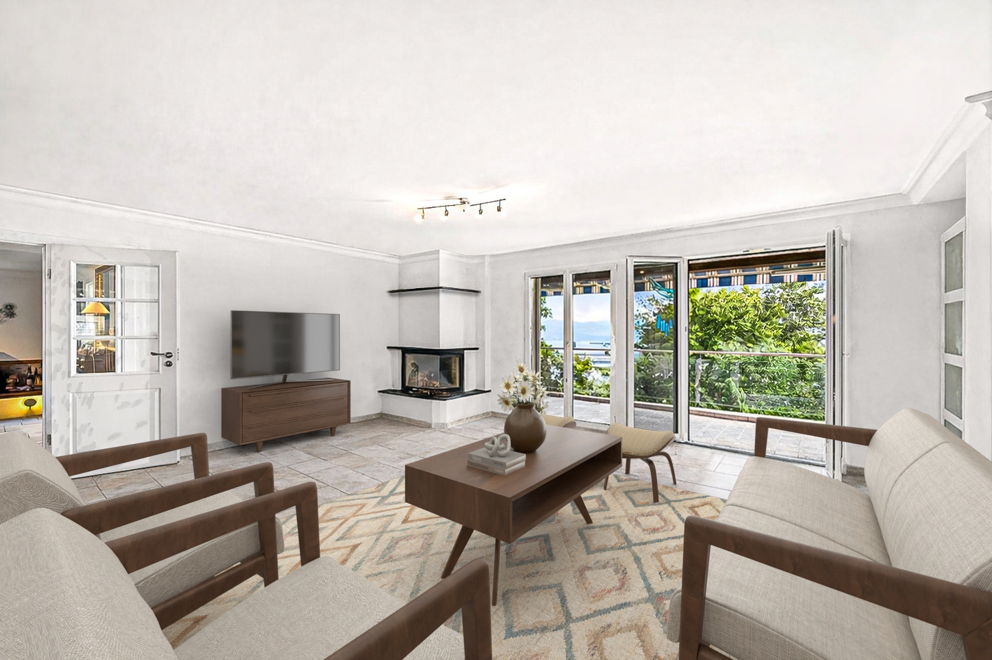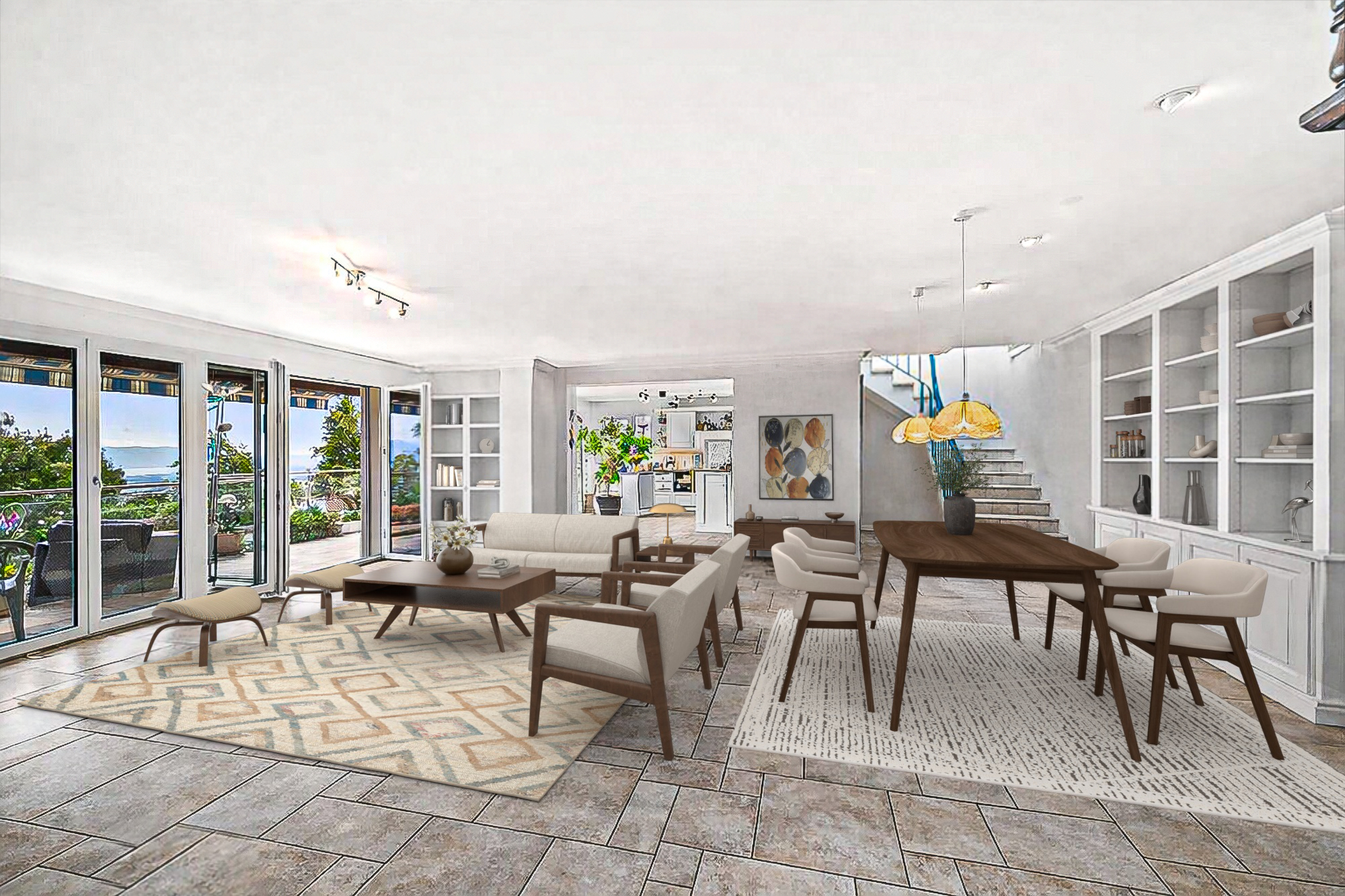 un salon, une cuisine ouverte, trois chambres et trois salles de bains dont une avec baignoire balnéo.