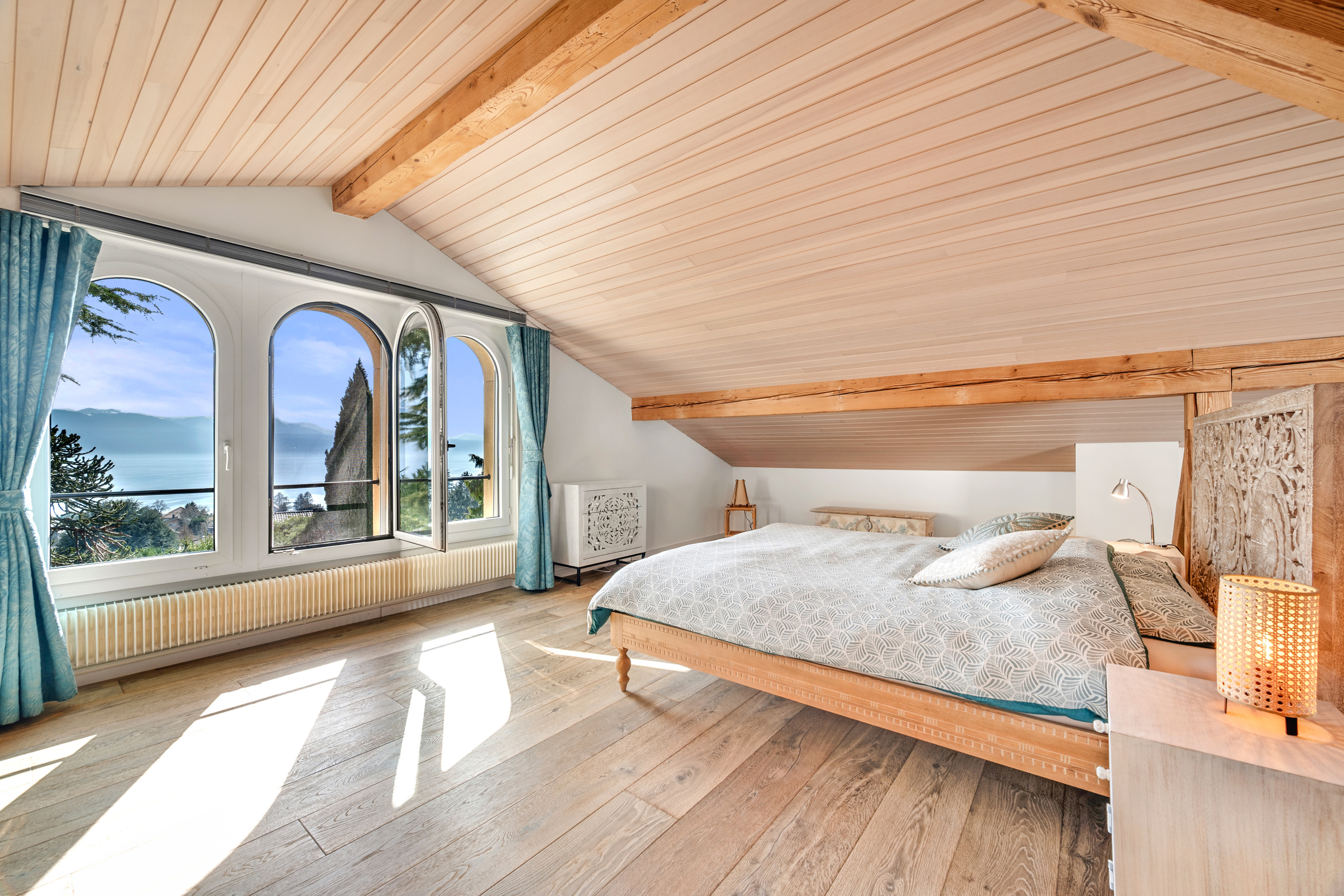 L’étage accueille une très grande chambre avec sa salle de bain.