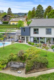 Cette superbe maison familiale de style contemporain a été construite en 2001 et offre une vue dégagée sur la campagne environnante, le Lac et les Alpes. Située en bordure de village, elle permet d'accéder rapidement aux commerces et bénéfiecie d'un environnement calme et bucolique. La maison de 330 m2 a été construite sur une parcelle de plus de 1400m2 de manière a profiter toute l'année du jardin et de la terrasse. Très agréables à vivre avec une circulation fluide, chacun des deux niveaux offre de beaux espaces; au rez de jardin, on peut profiter de plusieurs salons, d'une salle de billard et d'un joli bureau. La cuisine s'ouvre sur une belle salle à manger et sur la pergola qui abrite salle à manger d'été ouverte sur une grande terrasse et la piscine. L'étage accueille une grande suite parentale, trois chambres d'enfants, un bow-window avec un espace